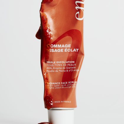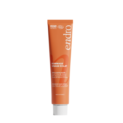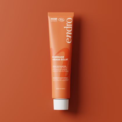 Ce Gommage Visage Eclat – Endro à triple exfoliation associe l’enzymes de grenade, la poudre de pêche et d’orange upcyclées, et les AHA issus du pomelo pour un soin complet du teint. Les enzymes de grenade agissent comme un exfoliant enzymatique pour révéler l’éclat et apporter une douceur immédiate, tandis que les poudres de fruits réalisent une exfoliation mécanique qui lisse la surface de la peau. Les AHA favorisent le renouvellement cellulaire, pour un grain de peau affiné et un teint lumineux, tout en respectant la sensibilité cutanée.