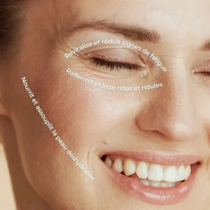 En remplacement de votre crème : chauffez 3 à 6* gouttes entre vos mains. Appliquez sur le visage en massages circulaires, en insistant sur les zones marquées.