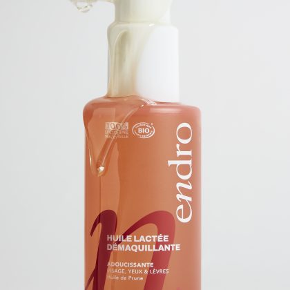 Huile Lactée Démaquillante – Endro. Grâce à l’association de deux huiles bio françaises, l’huile de tournesol et l’huile de prune, notre huile démaquillante permet d’éliminer toutes les traces de maquillage et les impuretés, y compris les plus tenaces, sur les yeux, les lèvres et le teint. Sa texture se transforme au contact de l’eau en effet lacté, pour un démaquillage agréable et doux.