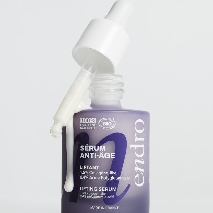 Ce Sérum Liftant Collagène – Endro est 100 % d’origine naturelle. Il a été formulé pour lisser et raffermir la peau. Il est concentré en collagène végétal et en acide polyglutamique, deux actifs reconnus pour leurs propriétés hydratantes. L’acide polyglutamique contribue à repulper la peau, tandis que le collagène-like aide à hydrater, lisser et lifter. La formule intègre également un extrait de pulpe de baobab, actif objectivé à effet tenseur immédiat, qui contribue à lisser rides et ridules dès la première application. Jour après jour, la peau retrouve élasticité et souplesse.